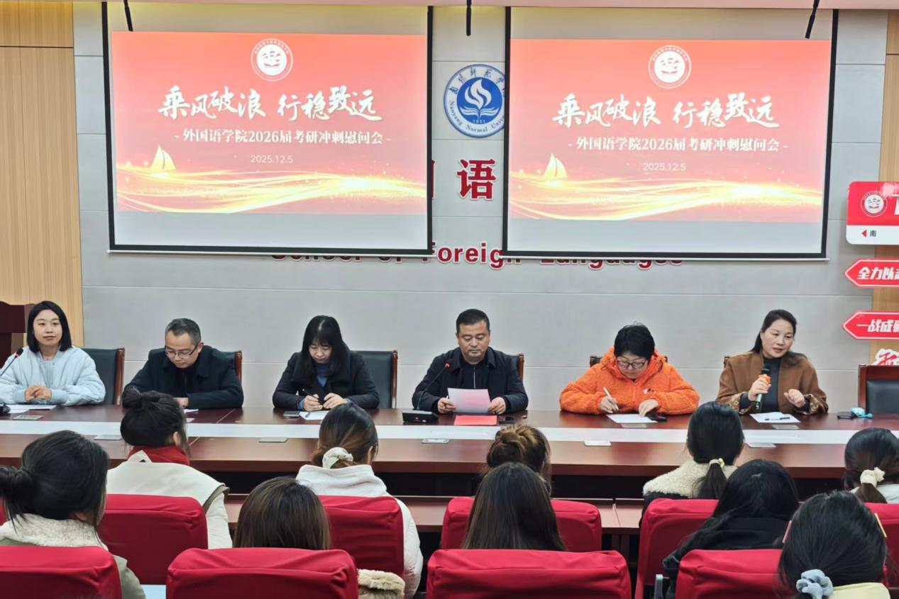 2026年全国硕士研究生招生考试在即,为帮助考研学子坚定备考信念、缓解冲刺压力,12月5日下午,外国语学院在外语楼115会议室举办考研慰问活动。学院院长孙志永、党委副书记马春蕾、副院长孙艳、副院长丁东粮、教师代表许文虎、毕业生辅导员郭一丹以及2022级考研学生代表共同参加了本次活动。