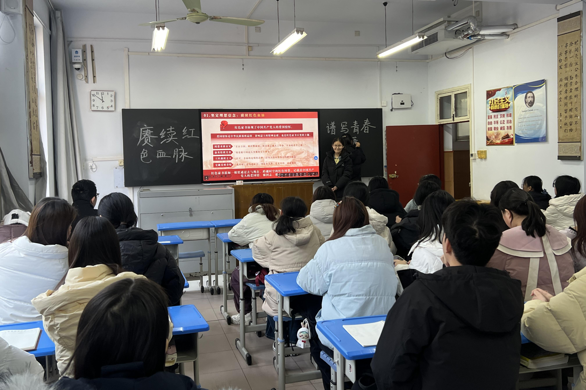 宣讲会上,主讲人以历史时间为轴,带领同学们回望了那段波澜壮阔的革命岁月,深刻阐释了红色血脉的精神内核与时代价值。她巧妙地将革命先辈为民族独立与解放矢志不渝、舍生忘死的感人事迹,与当代榜样在各自岗位上恪尽职守、奋勇争先的奋斗故事相结合。两代人的身影跨越时空、交相辉映,生动诠释了红色基因的传承,引导同学们深入思考新时代青年的使命与担当。此外,主讲人倡议在场的学生干部,要争做红色精神的坚定信仰者、主动传播者和模范践行者,将从中汲取的奋进力量,转化为服务同学、推进工作的实际行动,在日常学习与工作中交出优异的青春答卷。