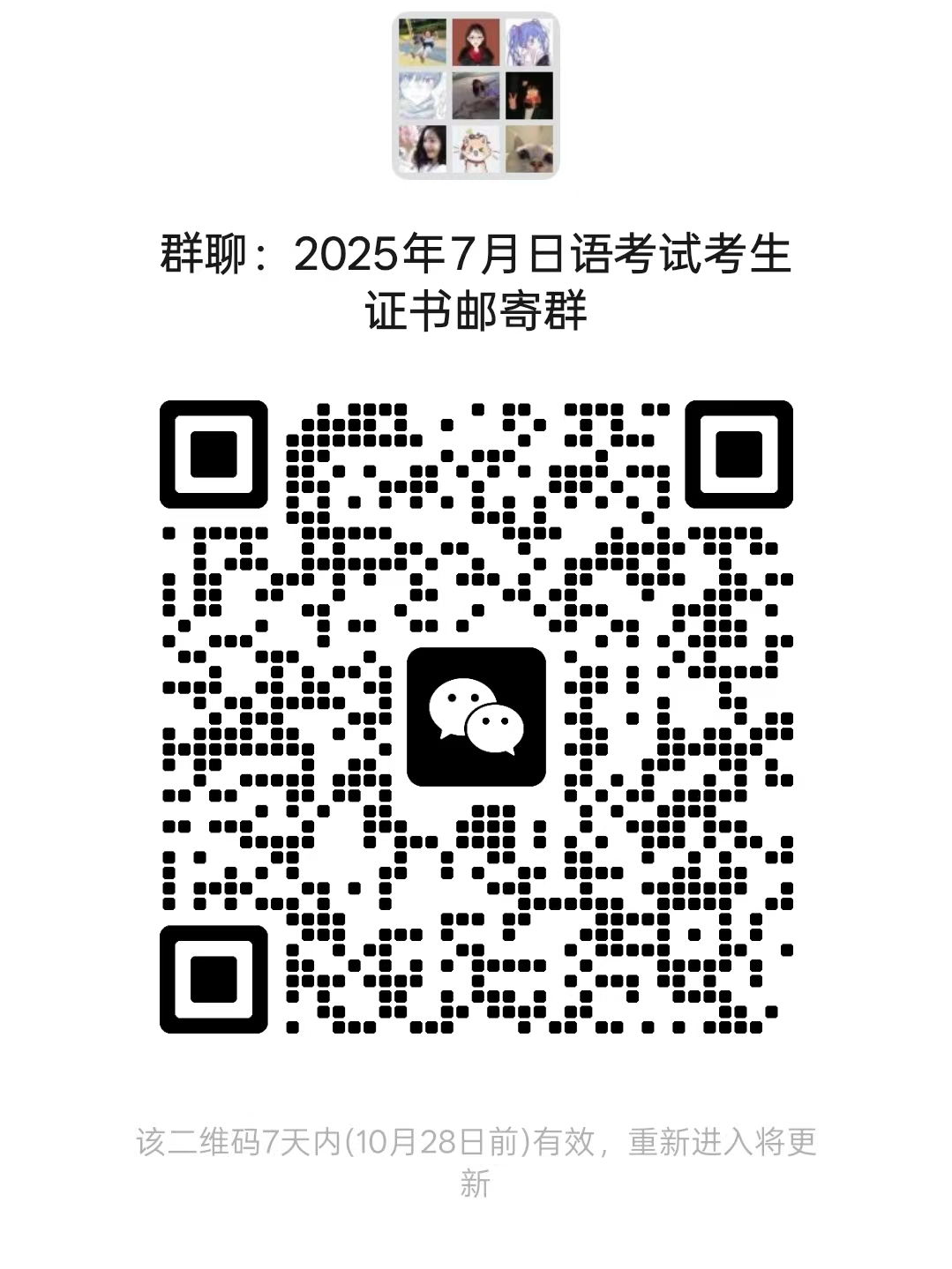 六、7月6日考试当日本考点建有微信群,微信群最新7日二维码见下图,证书领取结束后会解散。邮寄信息填写的问卷星二维码也见下图(https://www.wjx.top/vm/reL14p3.aspx# )。本通知将在学院网站(http://www2.nynu.edu.cn/yuanxi/wyxy/)和微信群同时下发。考点负责对考生的日本语能力测试证书和成绩单保管2年,请考生及时到现场领取或办理邮寄。