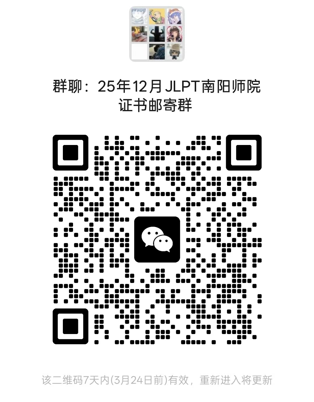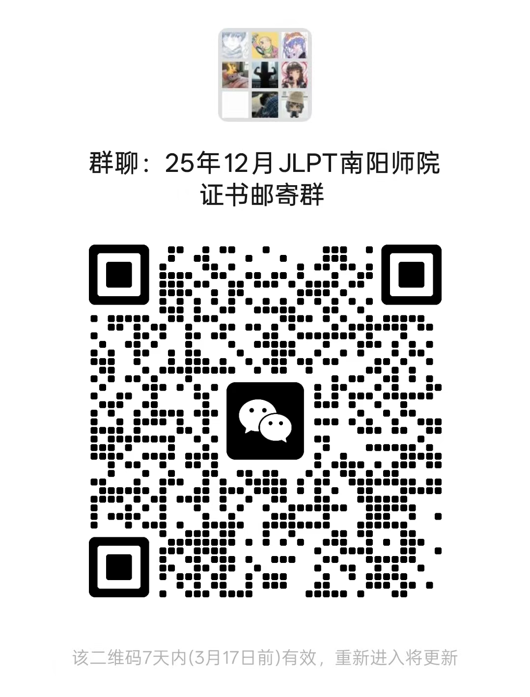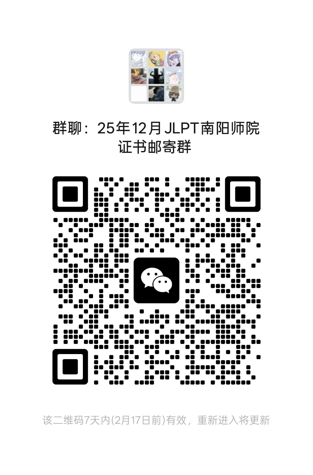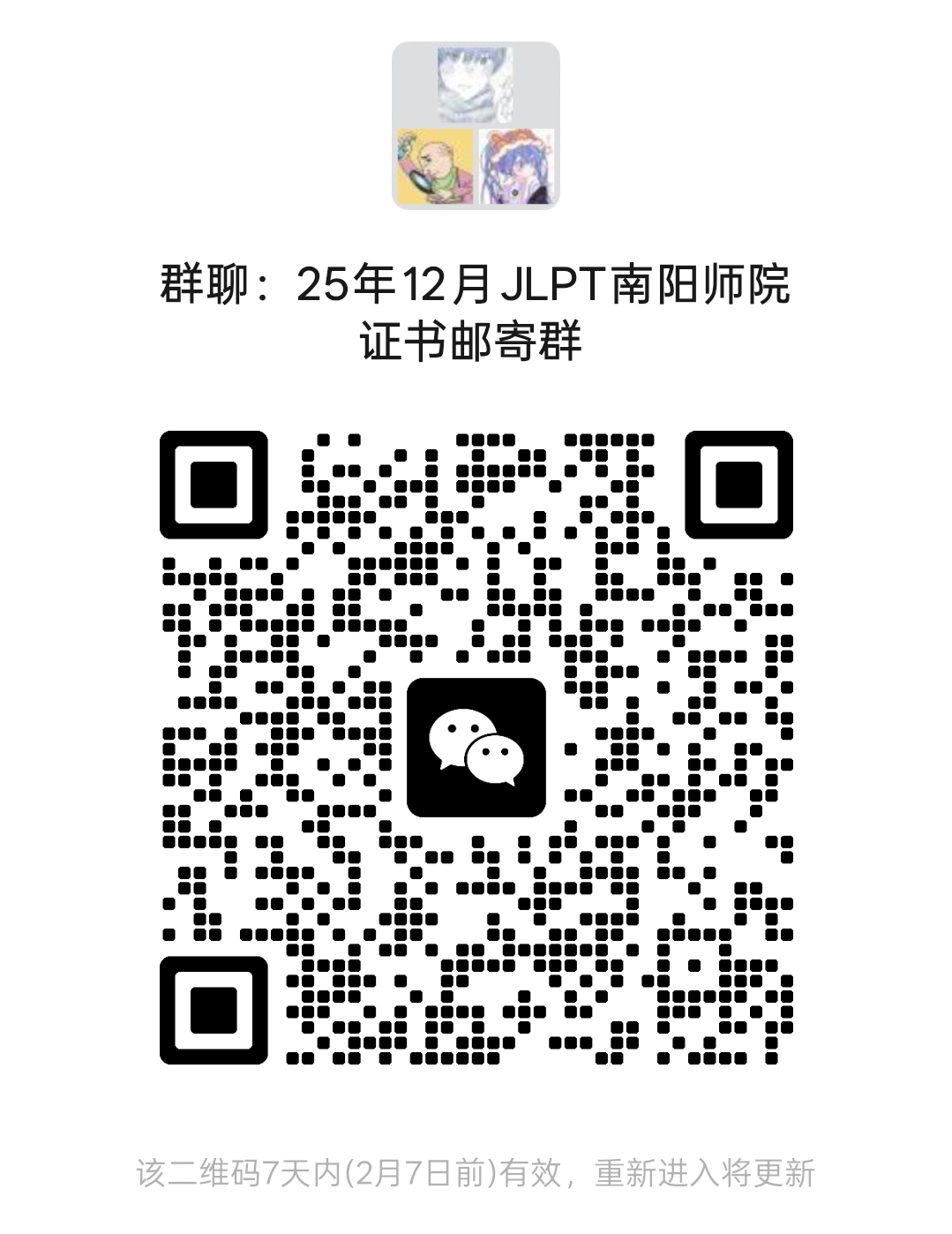 2025年12月7日日本语能力测试(JLPT)成绩已经公布,为做好本次考试后期的证书、成绩单发放邮寄工作,近期考点拟开始统计邮寄地址等信息,本次信息收集拟通过建微信群的方式进行,请本次考试成绩合格的考生通过扫描二维码的方式进入微信群(二维码见下图),本群仅作本次证书发放信息通知之用,进群后请遵守法律法规,不要在群里有不当言论。待考点后期收到教育部考试院邮寄过来的证书后,会在群里通知具体发放和邮寄事宜。证书领取工作结束后会本群会解散。
