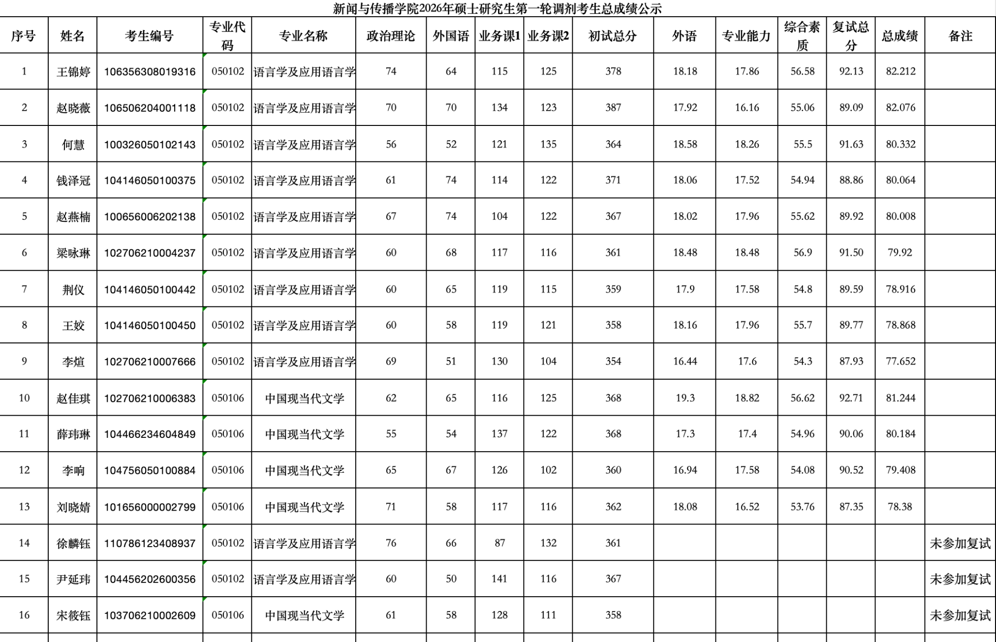 新闻与传播学院2026年硕士研究生第一轮调剂考生总成绩公示