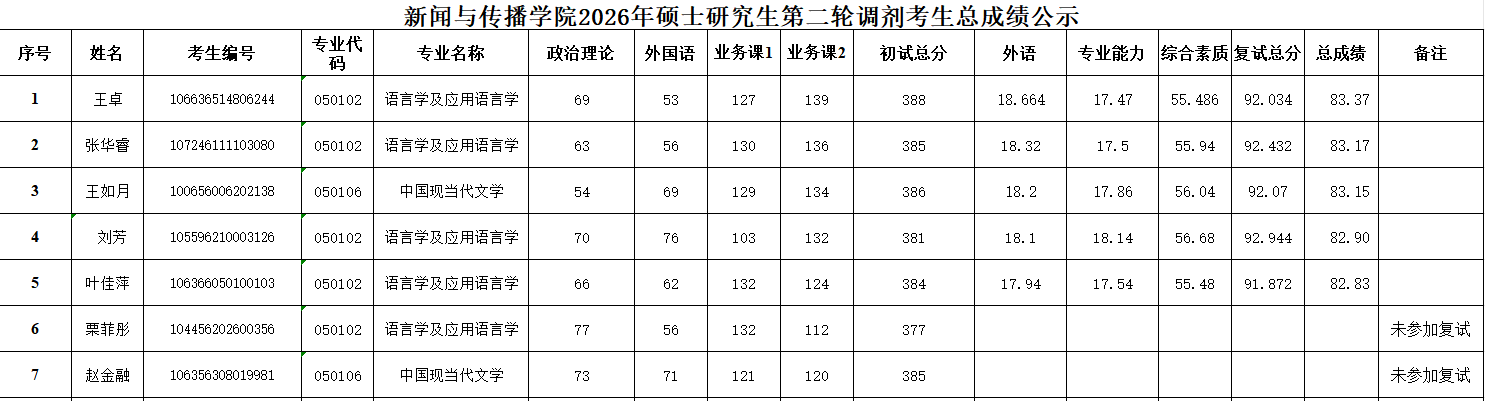 新闻与传播学院2026年硕士研究生第二轮调剂考生总成绩公示