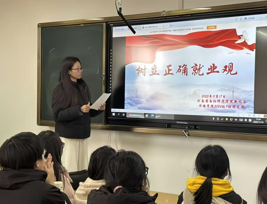 本网讯(燕羽惜/文 新闻与传播学院/图)为引导青年学子明确职业方向,破除传统就业误区,树立科学的就业理念,新闻与传播学院于11月17日开展了以“树立正确就业观”为主题的专题团课活动。