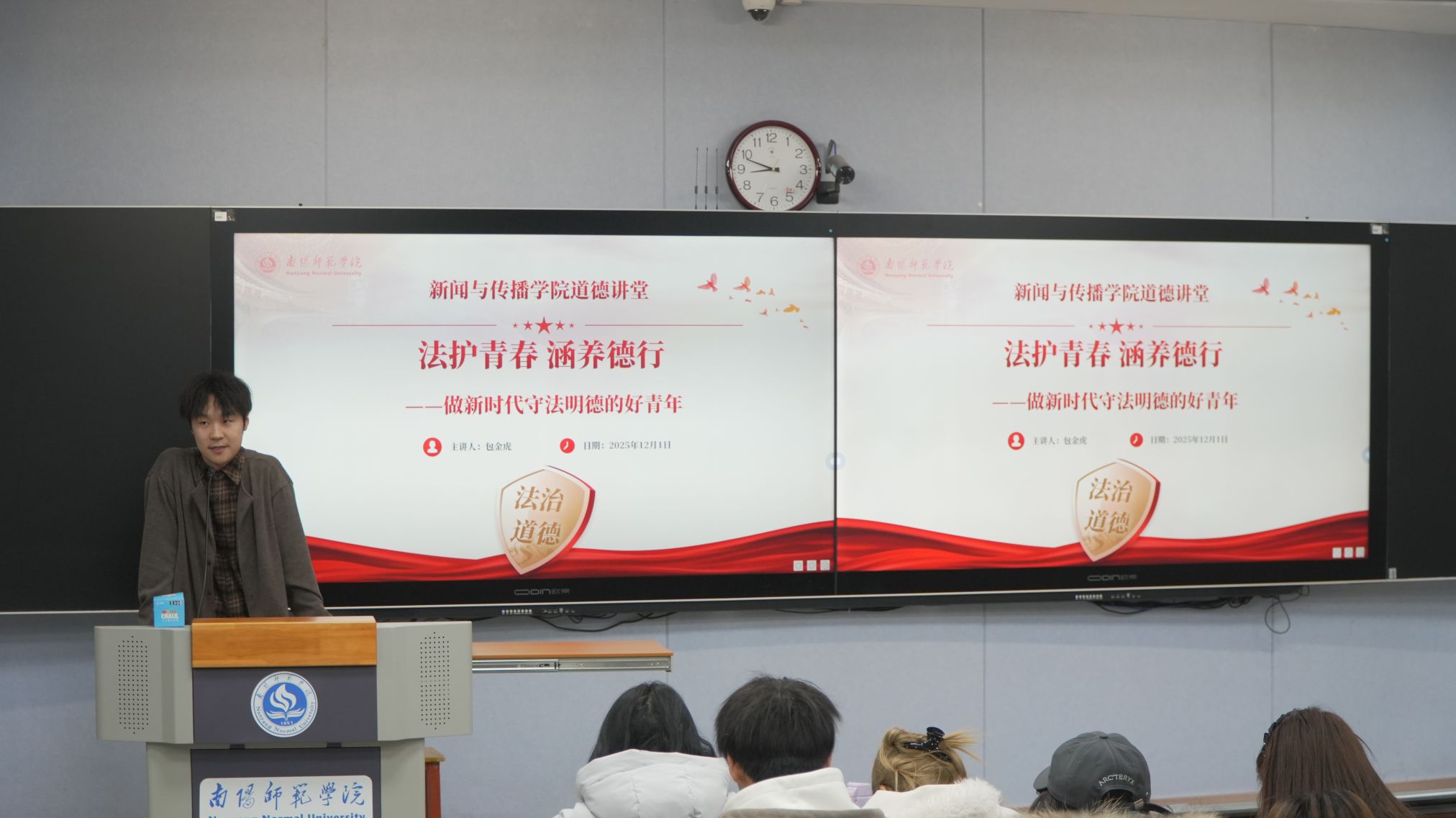 本网讯(冯铄捷/文 尚梓童/图)为增强学生法治观念与道德修养,12月1日晚,新闻与传播学院在综合楼102开展“法护青春,涵养德行——做新时代守法明德的好青年”主题道德讲堂活动。本次活动由包金虎老师主讲,2025级全体学生参与。