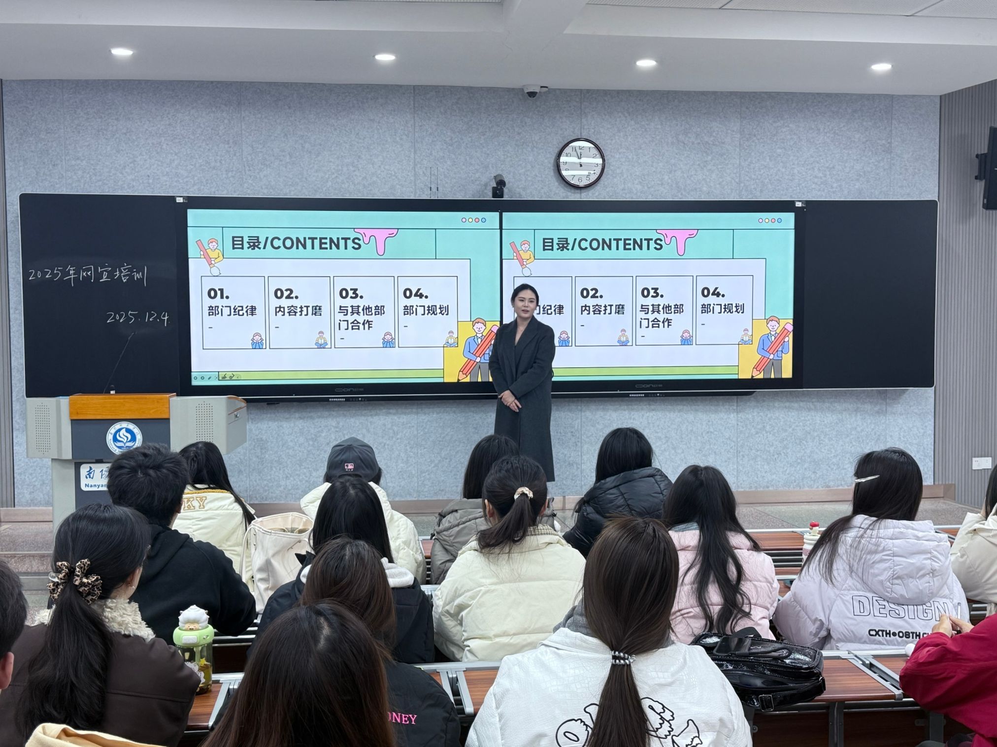 培训会上,冯中衡老师先结合部门实际情况,明确了工作考勤和任务响应等纪律性要求,强调了网宣工作的时效性和责任意识;其次,针对部门新闻稿、拍摄、推文等各模块内容进行讲解,分享了一些实用技巧;最后冯中衡老师提出了部门发展目标和规划,鼓励成员们积极策划和参与活动。