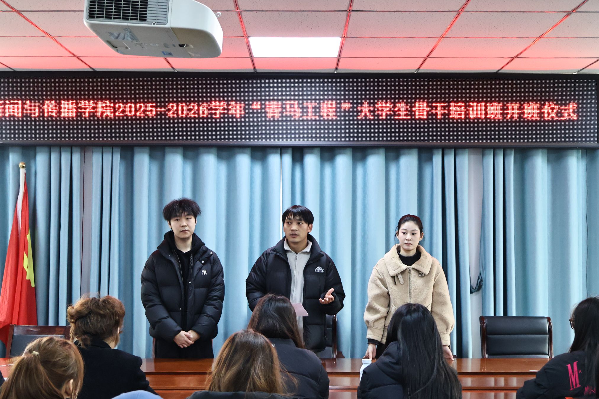 本网讯(魏晴雅鸽/文 新闻与传播学院/图)为加强对青年学生的思想政治引领,培养一批信仰坚定、能力突出的青年团员骨干,11月21日,新闻与传播学院于东区办公楼401举行了2025-2026学年“青马工程大学生骨干培训班”开班仪式。此次仪式由新闻与传播学院刘更老师主讲,青马工程全体学员共同参与。