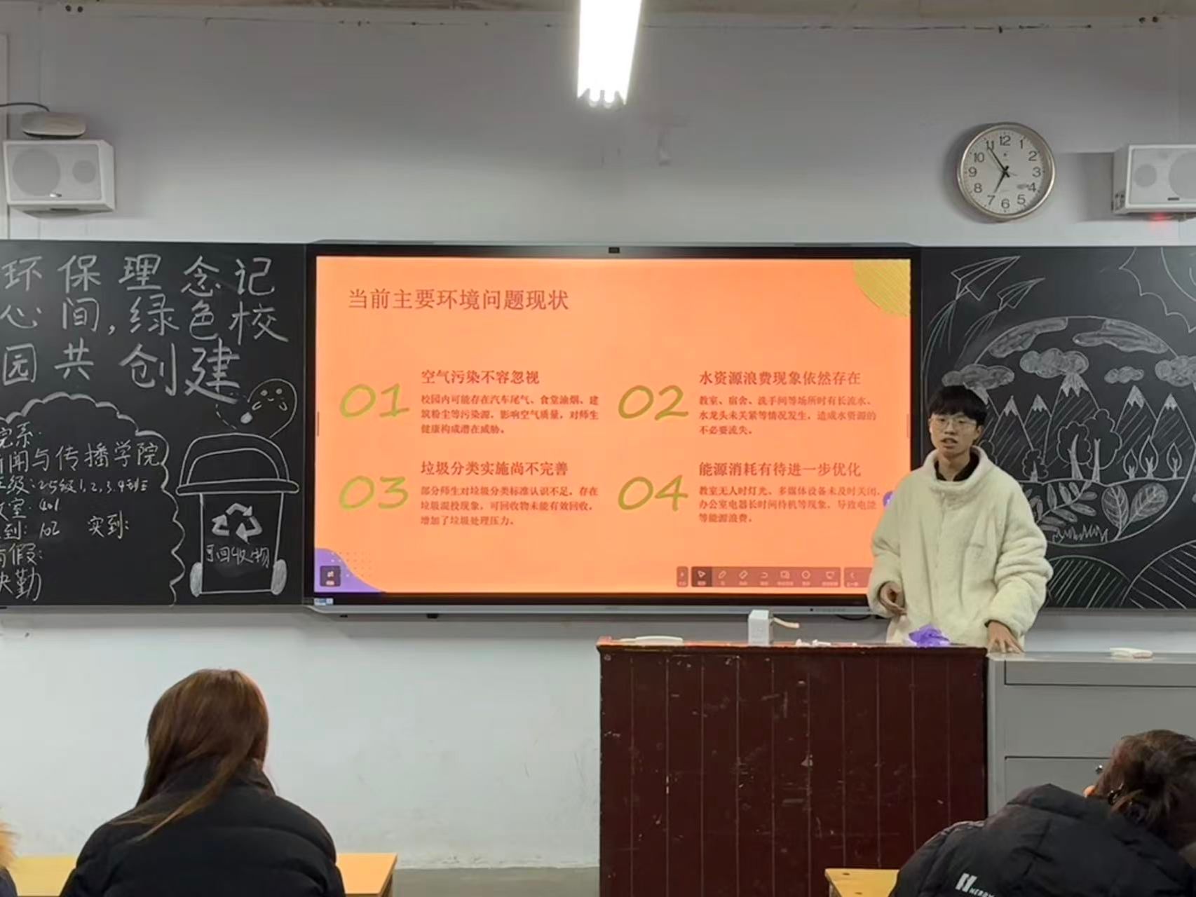 班会上,班委通过播放环保纪录片片段、展示校园垃圾分类现状数据,强调环保的重要性,并号召同学们从随手关灯、分类投放垃圾等小事做起,将环保理念融入日常。同时还梳理了校园内随手丢弃外卖餐盒、绿植养护不到位、公共区域水电浪费等常见的环保疏漏问题,提醒大家共同关注并及时整改。