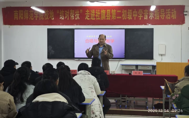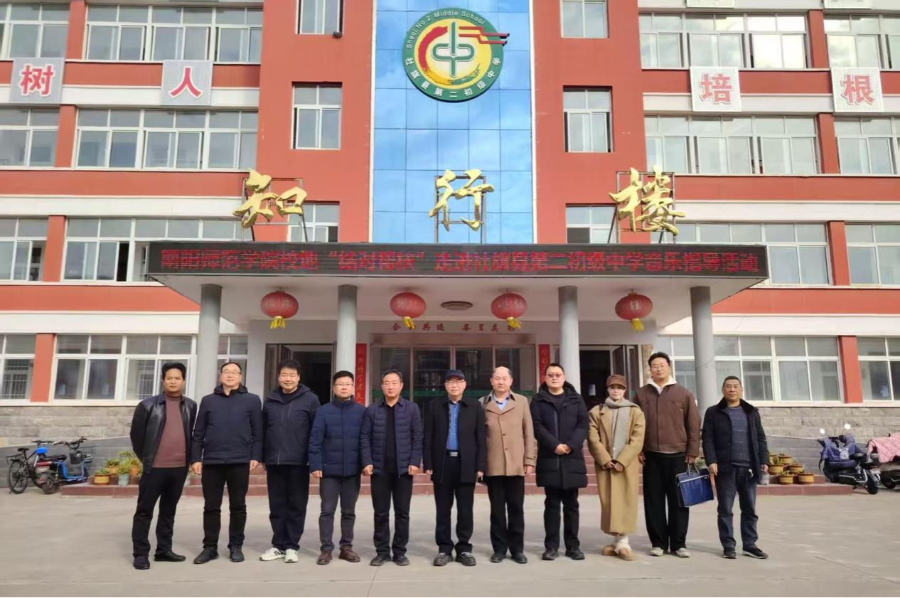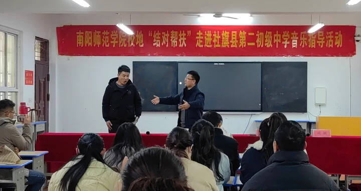 2025年12月4日,音乐学院党委书记黄爱民、党委副书记高志刚带领专业教师团队赴社旗县,开展“校地结对帮扶”专业指导活动。社旗县教体局及第二初级中学相关领导出席活动,共同见证校地协同赋能基层音乐教育提质增效的务实实践。