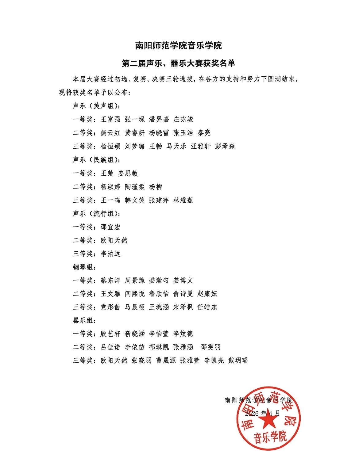 南阳师范学院音乐学院第二届声乐、器乐大赛获奖名单