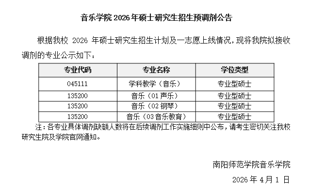 音乐学院2026年硕士研究生招生预调剂公告