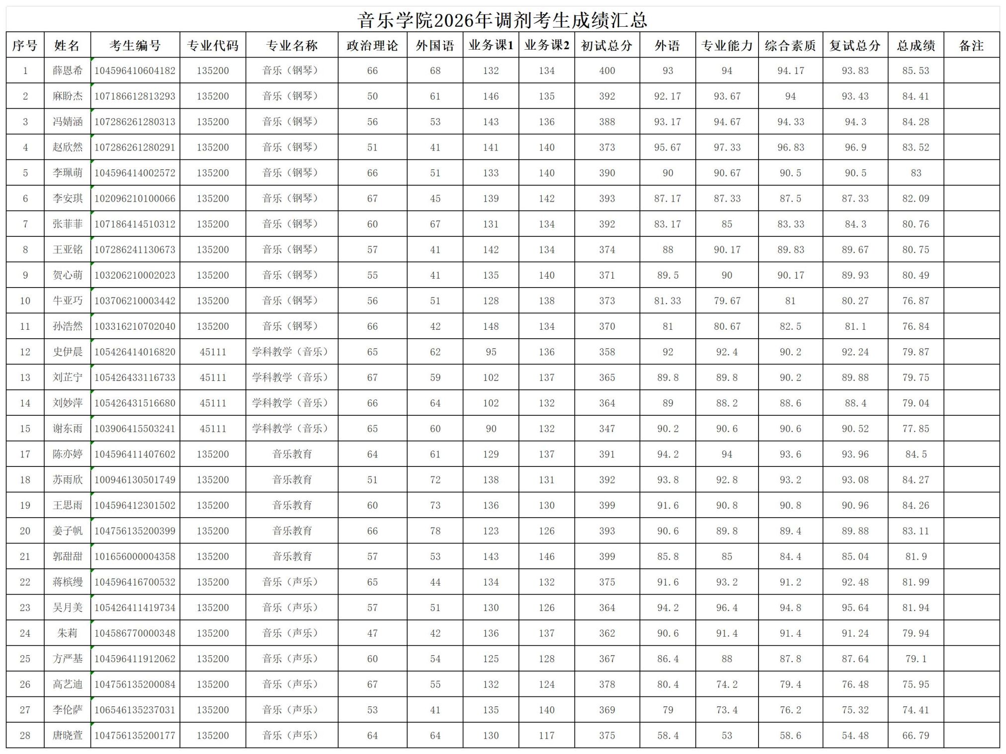 音乐学院2026年调剂考生成绩汇总