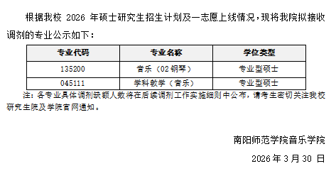 音乐学院2026年硕士研究生招生预调剂公告